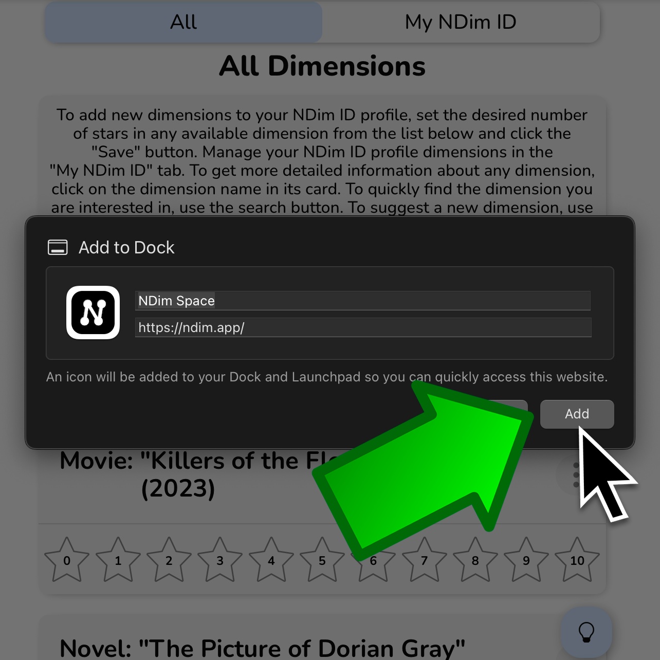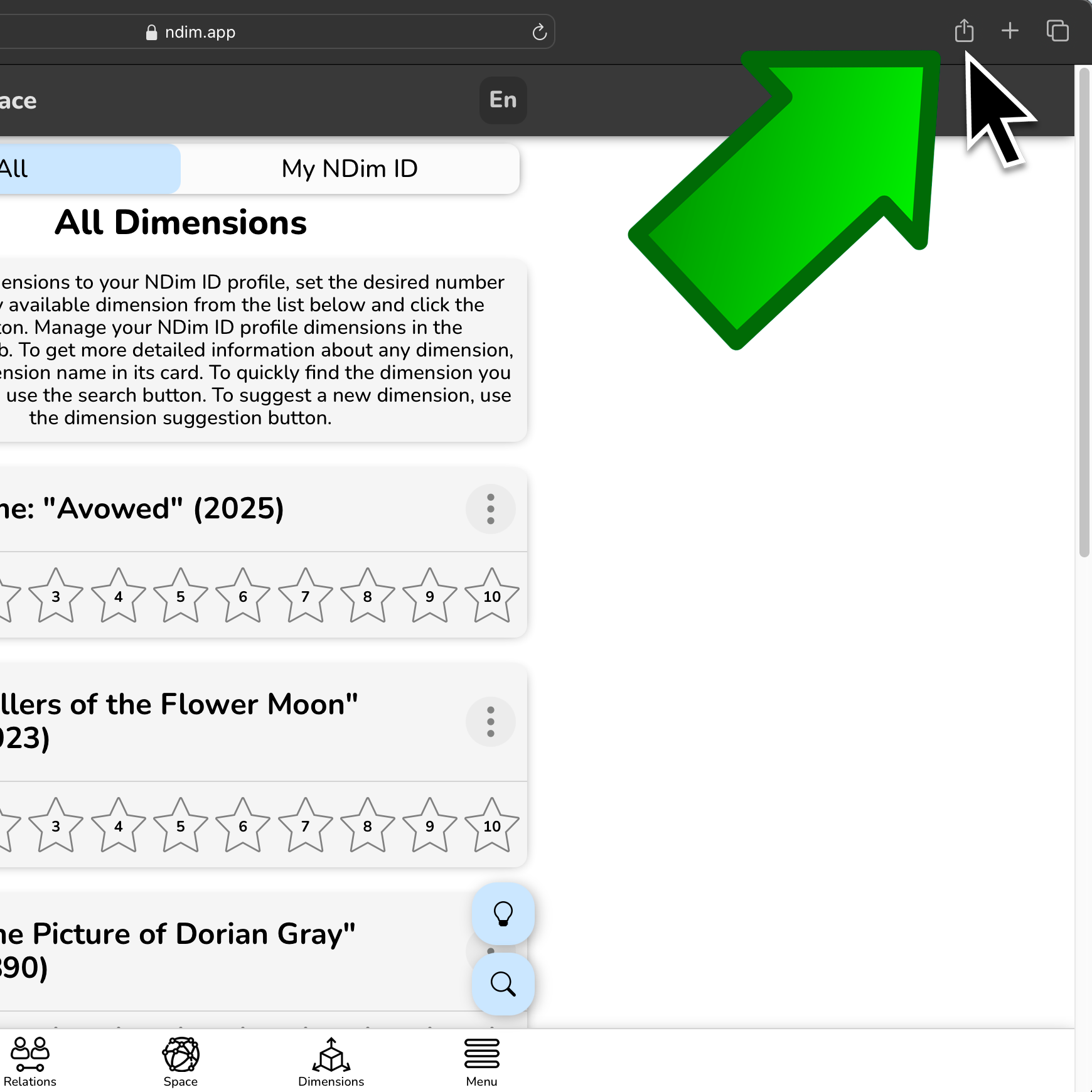 To edit a dimension in your NDim ID, change the number of selected stars inside the dimension card and click "Save". To delete a dimension from your NDim ID, click the cross inside the dimension card. The deleted dimensions will return to the "All" tab.