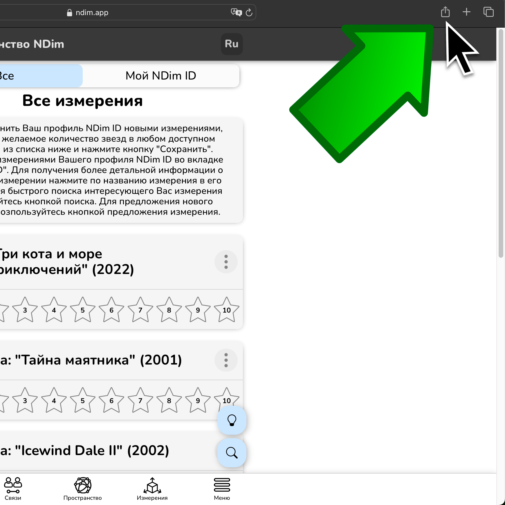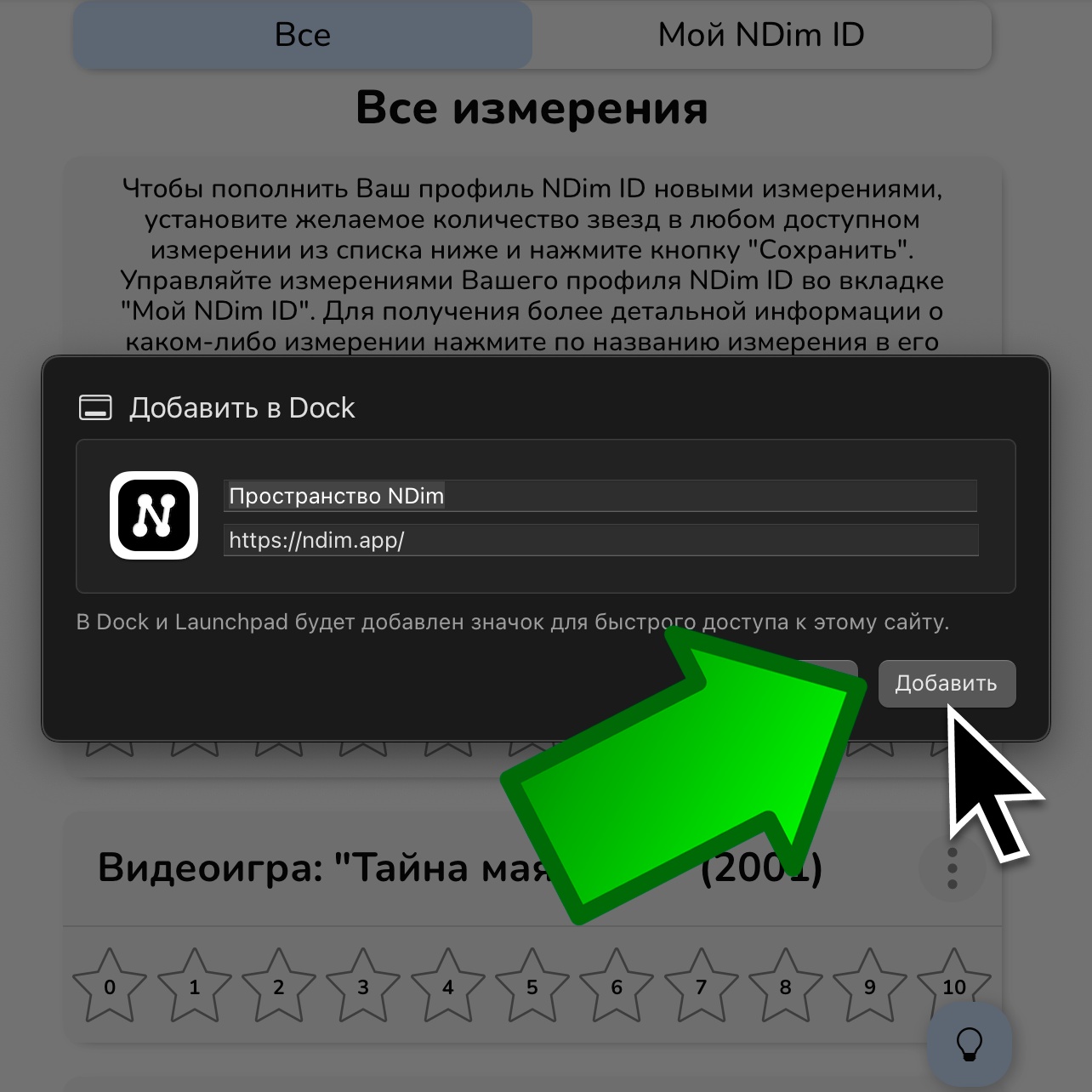 Чтобы отредактировать измерение в Вашем NDim ID, измените количество выбранных звёзд внутри карточки измерения и нажмите "Сохранить". Чтобы удалить измерение из Вашего NDim ID, нажмите по крестику внутри карточки измерения. Удалённые измерения вернутся во вкладку "Все".
